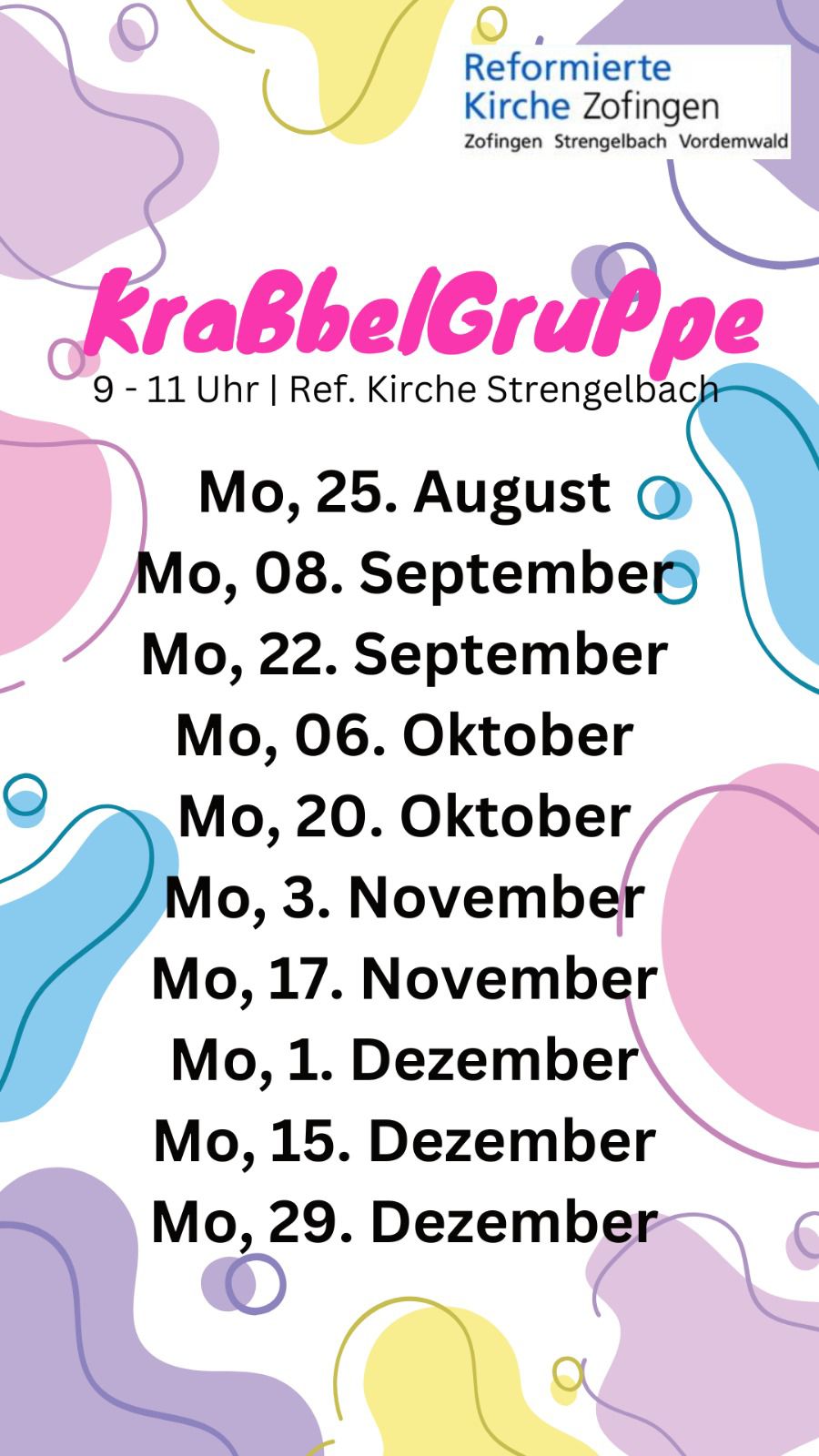 Spiel- und KrabbeltreffZum Spiel- und Krabbeltreff sind alle Kinder bis zum Kindergarten in Begleitung eines Erwachsenen willkommen. Der Treff findet jeweils am Montag von 09.00-11.00 Uhr im Kirchgemeindehaus Strengelbach statt. Wir freuen uns auf euch!