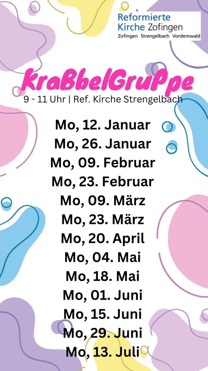 Spiel- und KrabbeltreffZum Spiel- und Krabbeltreff sind alle Kinder bis zum Kindergarten in Begleitung eines Erwachsenen willkommen. Der Treff findet jeweils am Montag von 09.00-11.00 Uhr im Kirchgemeindehaus Strengelbach statt. Wir freuen uns auf euch!