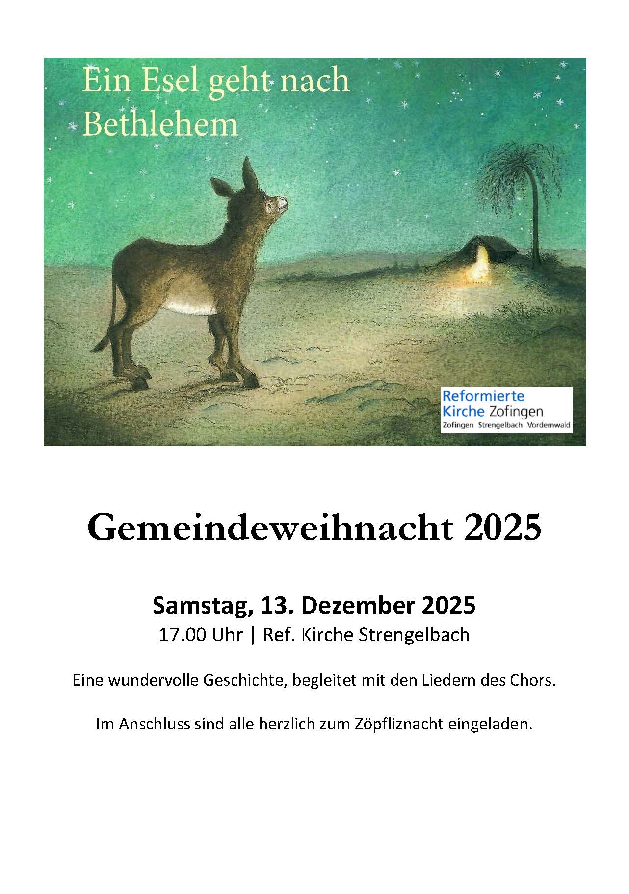 Gemeindeweihnacht Strengelbach![]() Die Gemeindeweihnacht in Strengelbach findet am Samstag, 13. Dezember 2025 um 17.00 Uhr in der Kirche Strengelbach statt.