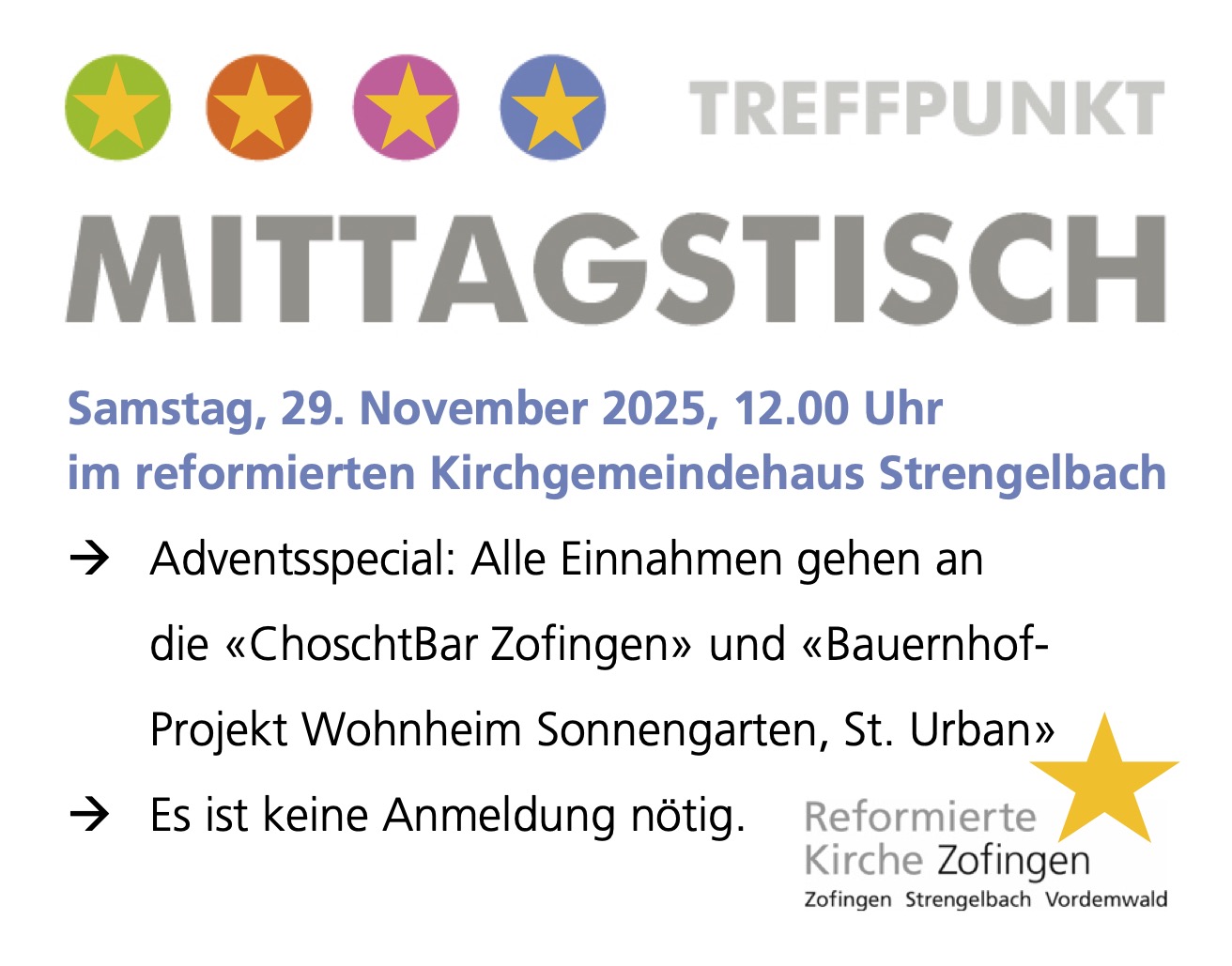 Mittagstisch Strengelbach mit AdventsspecialAm Samstag, 29. November 2025 um 12.00 Uhr sind Jung und Alt herzlich zum Mittagstisch mit Adventsspecial im Reformierten Kirchgemeindehaus Strengelbach eingeladen. ![]()
