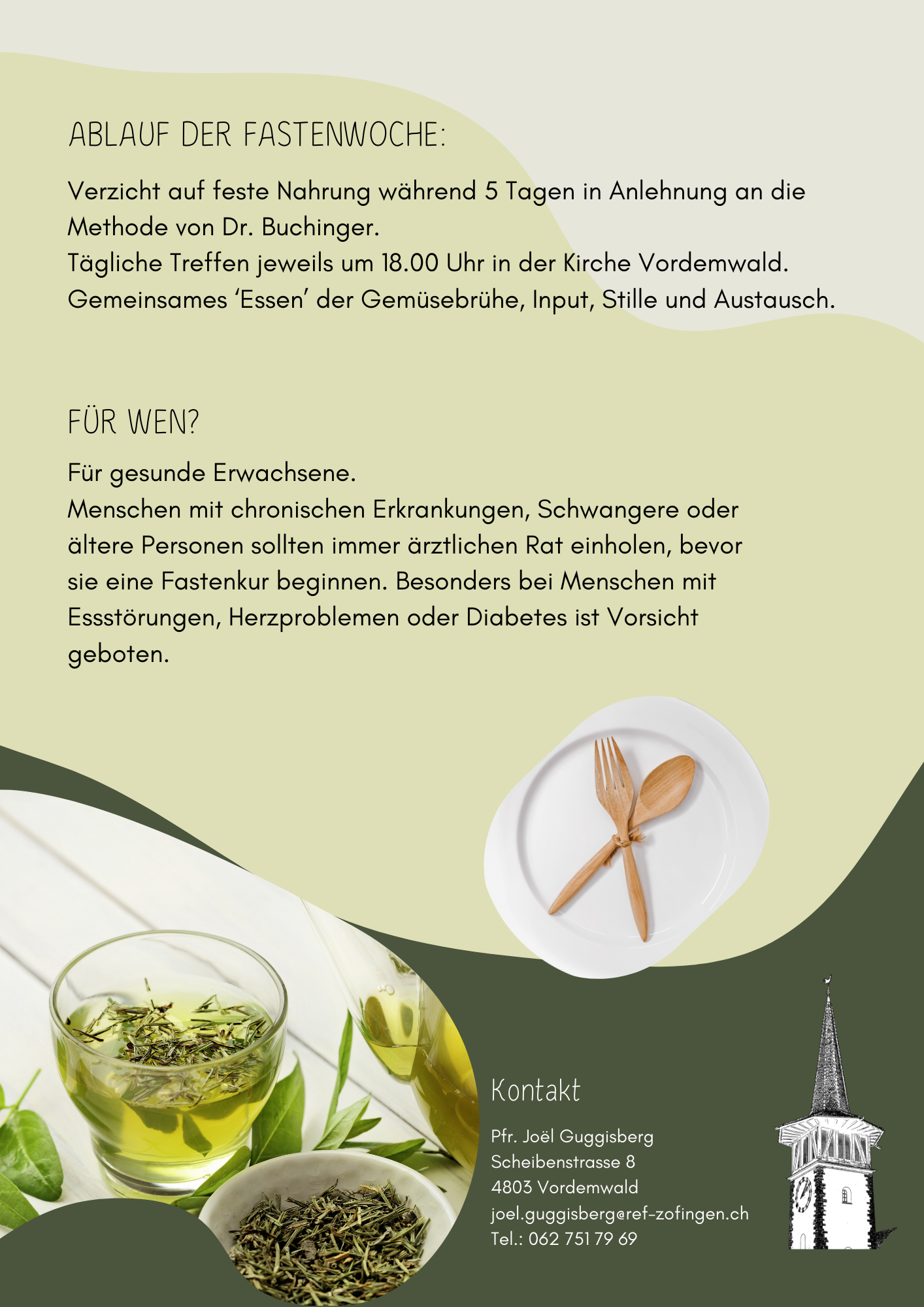 ![]() Fastenwoche«Eine Fastenwoche, das wäre doch einmal etwas». Mit dem Gedanken und mit der Umsetzung auch für weitere Beteiligte beschäftigte sich Pfr. Joël Guggisberg.